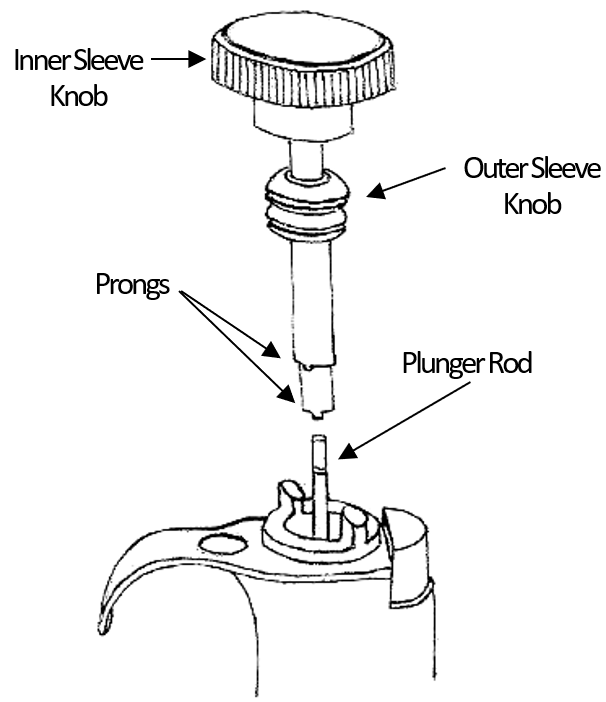Turn the Outer Sleeve Knob of the calibration tool, pressing gently, until the two prongs on the end of the outer sleeve enter the two grooves in the pipette adjustment outer ring.