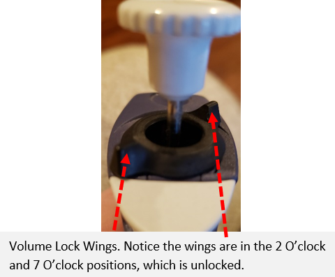 Pipet-Lite volume lock wings in unlocked position