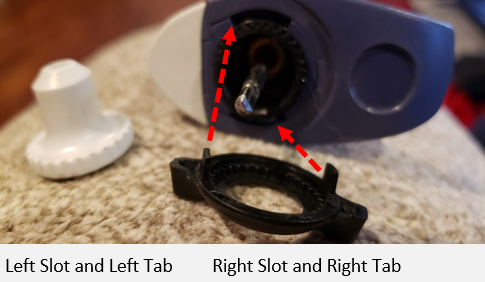 Step 5: Place one of the square tabs on the underside of the volume lock into the left slot on the pipette body and the other tab into the right slot on the body.