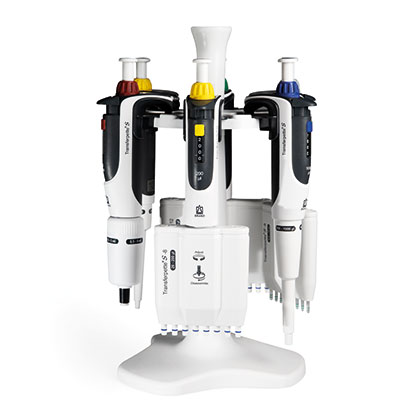 Bench top carousel rack for six Transferpette S single channel or multichannel pipettes.